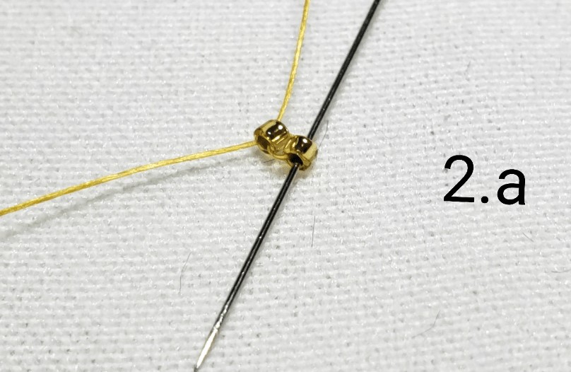 2. Después, toma las dos mostacillas amarillas y deslízalas suavemente hacia abajo del hilo, deja un extremo suelto para trabajar con él más tarde.
