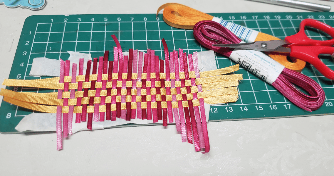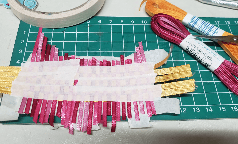 Con cinta delgada en dos tonos, realiza un rectángulo entretejiéndolas, para asegurarte que no se desarme le colocas cinta tirro por los cuatro lados.